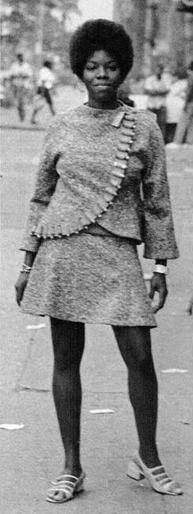 The Revolutionary Suit (1968) is a two-piece suit that has Jarrell’s signature style from the late 60s. The suit has a tweed, collarless jacket and a-framed skirt, which matched the fashion trends of the time. This ensemble also incorporates a colorful, faux bandolier that stands out against the salt-and-pepper color of the suit. This piece, which inspired ideas about wearing clothing for protest and revolution, motivated Jet magazine to write a piece called “Black Revolt Sparks White Fashion Craze” which criticized white, mainstream fashion for cultural appropriation. The magazine accused the fashion world of taking the bandolier, which was meant to be a symbol of the righteous protest against the unfair treatment of African Americans, and attempting to turn it into a trendy accessory.